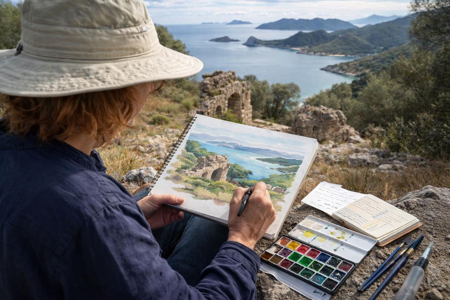 noktalarda gözlem yaparak, manzaraları ve arkeolojik kalıntıları resim, eskiz,